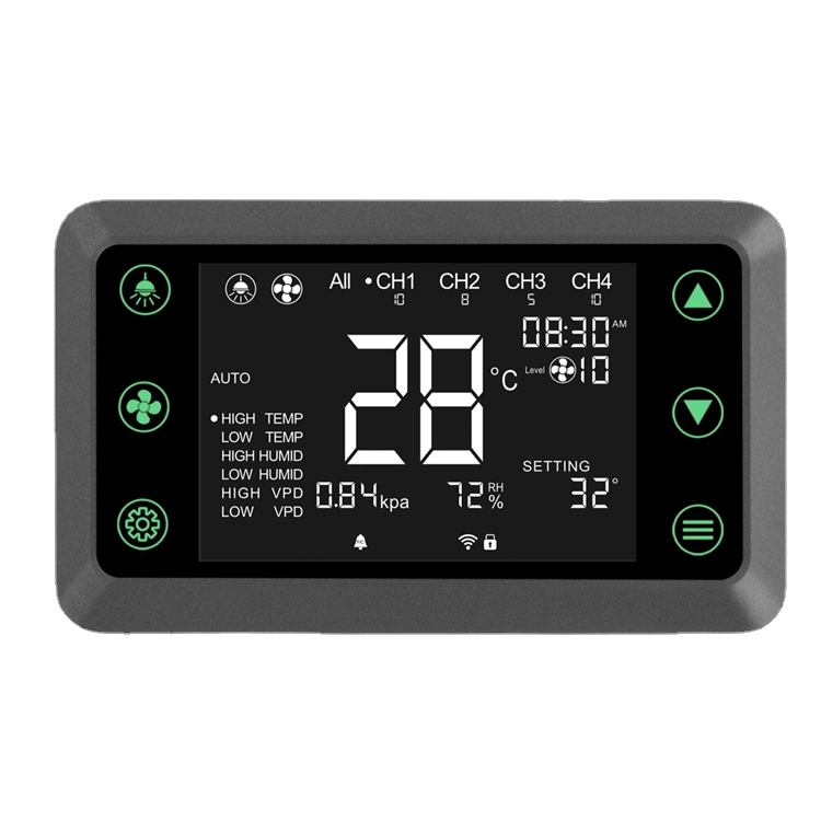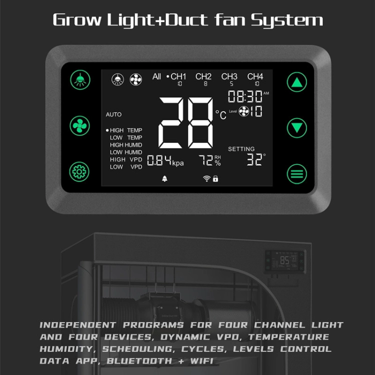 Controlado Digital Green Power con programas independientes para cuatro canales de luz y cuatro dispositivos, VPD dinámico, temperatura, humedad, programación, ciclos, aplicación de datos de control de nivel, Bluetooth + wifi.