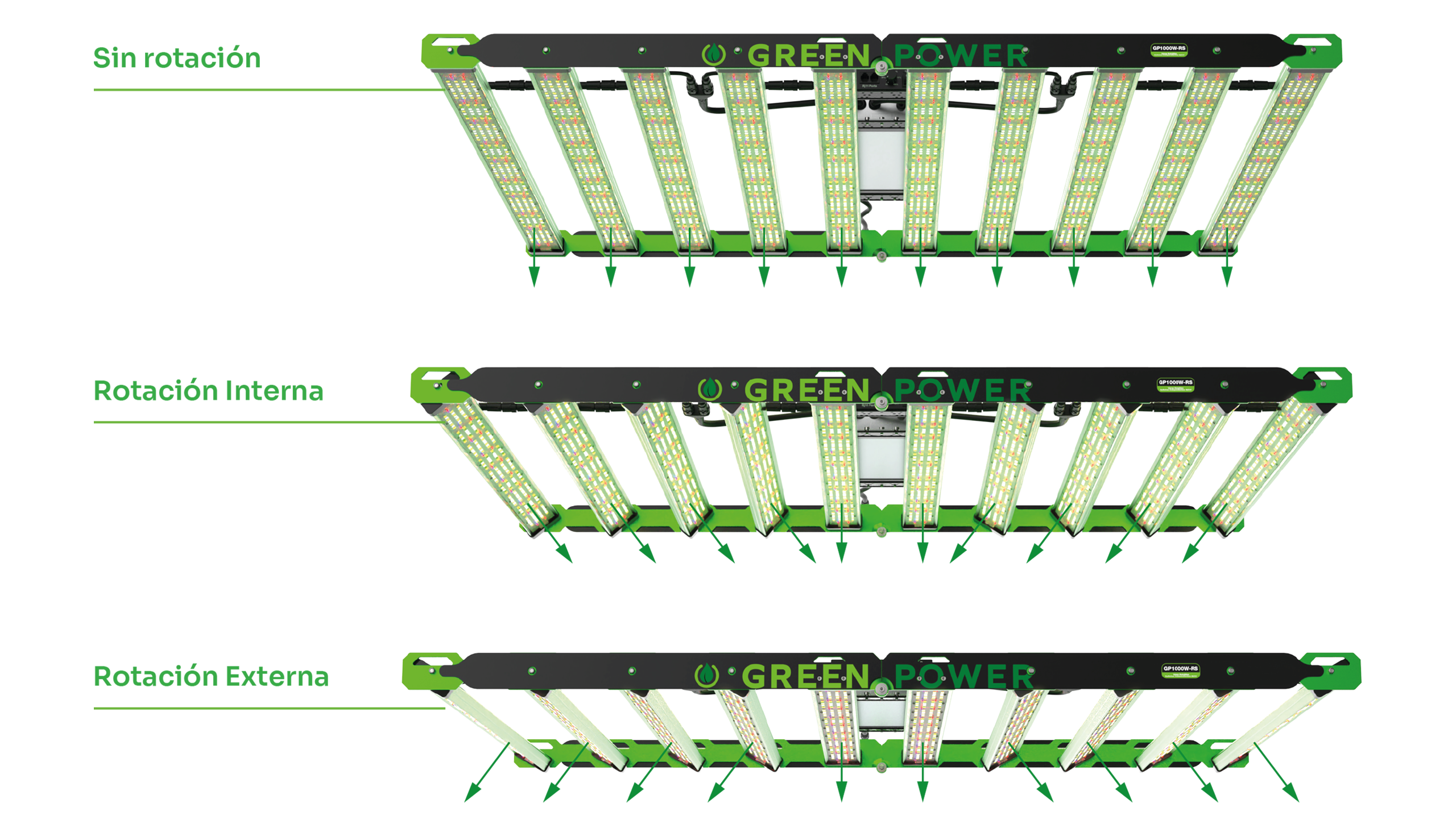 La luz de cultivo LED para horticultura industrial está diseñada para hacer un uso eficiente de la energía. El modelo GP1000W-RS utiliza 10 varas de Quantum Board de luz blanca de alta eficiencia y espectro completo diseñados a medida con Samsung LM301h EVO + Samsung EVO Mint Wihte + Rojos de 660 nm + Green Emerald + IR + UV. Esta unidad es regulable, con una potencia de salida de 1000 vatios. El Dimmer cuenta con switches con la capacidad de prender y apagar los leds de IR y UV por separado. también se pueden conectar en cadena múltiples equipos desde la función Comando en Cadena. Por otro lado, las varas se pueden rotar para amplificar o concentrar a luz en el área de cultivo. El equipo también tiene la capacidad de plegarse para lograr mayor versatilidad en el área de cultivo.